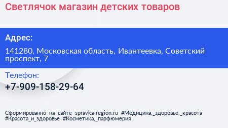Светлячок, магазин детских товаров по адресу 141280, Московская область, Ивантеевка, Советский проспект, 7 в дальнейшем Организация, размещена в следующих категориях: