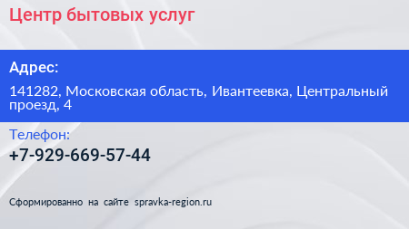 Центр бытовых услуг по адресу 141282, Московская область, Ивантеевка, Центральный проезд, 4 в дальнейшем Организация, размещена в следующих категориях: