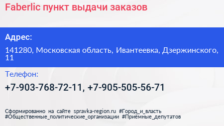 Faberlic, пункт выдачи заказов по адресу 141280, Московская область, Ивантеевка, Дзержинского, 11 в дальнейшем Организация, размещена в следующих категориях: