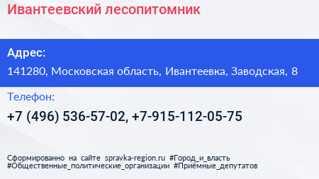 Ивантеевский лесопитомник по адресу 141280, Московская область, Ивантеевка, Заводская, 8 в дальнейшем Организация, размещена в следующих категориях: