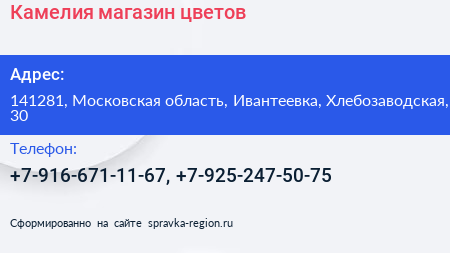 Камелия, магазин цветов по адресу 141281, Московская область, Ивантеевка, Хлебозаводская, 30 в дальнейшем Организация, размещена в следующих категориях: