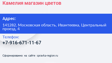 Камелия, магазин цветов по адресу 141282, Московская область, Ивантеевка, Центральный проезд, 4 в дальнейшем Организация, размещена в следующих категориях: