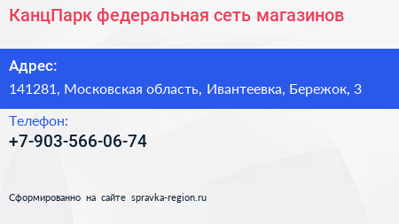 КанцПарк, федеральная сеть магазинов по адресу 141281, Московская область, Ивантеевка, Бережок, 3 в дальнейшем Организация, размещена в следующих категориях:
