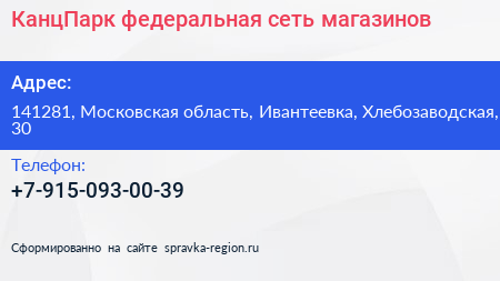 КанцПарк, федеральная сеть магазинов по адресу 141281, Московская область, Ивантеевка, Хлебозаводская, 30 в дальнейшем Организация, размещена в следующих категориях: