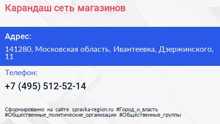 Карандаш, сеть магазинов по адресу 141280, Московская область, Ивантеевка, Дзержинского, 11 в дальнейшем Организация, размещена в следующих категориях:
