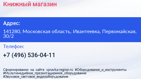Книжный магазин по адресу 141280, Московская область, Ивантеевка, Первомайская, 30/2 в дальнейшем Организация, размещена в следующих категориях: