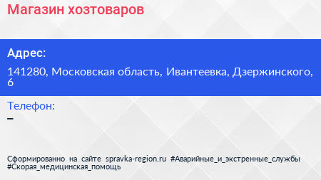 Магазин хозтоваров по адресу 141280, Московская область, Ивантеевка, Дзержинского, 6 в дальнейшем Организация, размещена в следующих категориях: