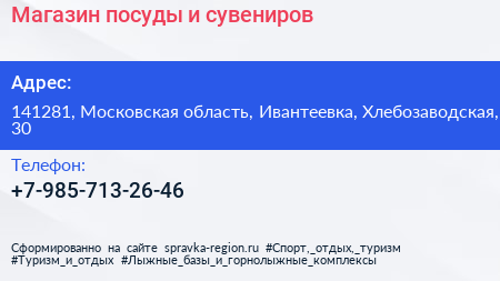 Магазин посуды и сувениров по адресу 141281, Московская область, Ивантеевка, Хлебозаводская, 30 в дальнейшем Организация, размещена в следующих категориях: