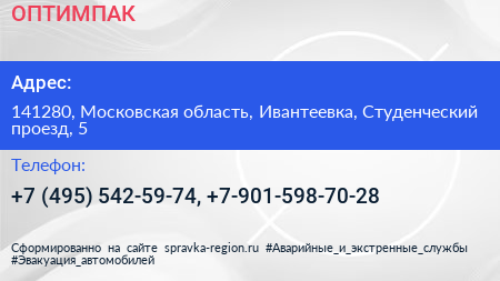 ОПТИМПАК по адресу 141280, Московская область, Ивантеевка, Студенческий проезд, 5 в дальнейшем Организация, размещена в следующих категориях: