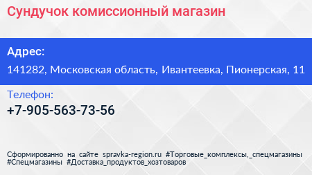 Сундучок, комиссионный магазин по адресу 141282, Московская область, Ивантеевка, Пионерская, 11 в дальнейшем Организация, размещена в следующих категориях: