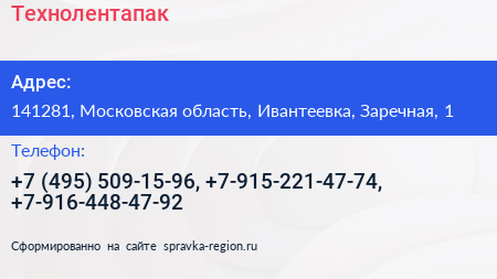 Технолентапак по адресу 141281, Московская область, Ивантеевка, Заречная, 1 в дальнейшем Организация, размещена в следующих категориях:
