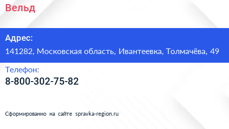 Вельд по адресу 141282, Московская область, Ивантеевка, Толмачёва, 49 в дальнейшем Организация, размещена в следующих категориях: