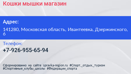 Кошки мышки, магазин по адресу 141280, Московская область, Ивантеевка, Дзержинского, 6 в дальнейшем Организация, размещена в следующих категориях: