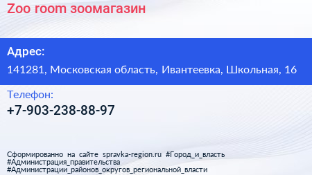 Zoo room, зоомагазин по адресу 141281, Московская область, Ивантеевка, Школьная, 16 в дальнейшем Организация, размещена в следующих категориях: