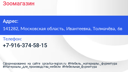 Зоомагазин по адресу 141282, Московская область, Ивантеевка, Толмачёва, 6в в дальнейшем Организация, размещена в следующих категориях: