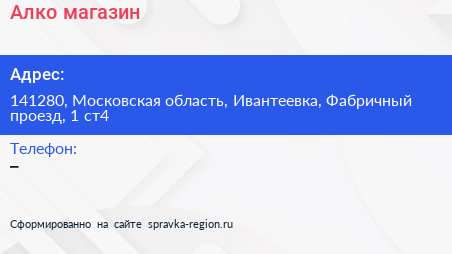 Алко, магазин по адресу 141280, Московская область, Ивантеевка, Фабричный проезд, 1 ст4 в дальнейшем Организация, размещена в следующих категориях: