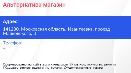 Альтернатива, магазин по адресу 141280, Московская область, Ивантеевка, проезд Маяковского, 3 в дальнейшем Организация, размещена в следующих категориях:
