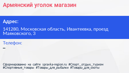 Армянский уголок, магазин по адресу 141280, Московская область, Ивантеевка, проезд Маяковского, 3 в дальнейшем Организация, размещена в следующих категориях: