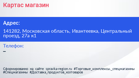 Картас, магазин по адресу 141282, Московская область, Ивантеевка, Центральный проезд, 27а к1 в дальнейшем Организация, размещена в следующих категориях: