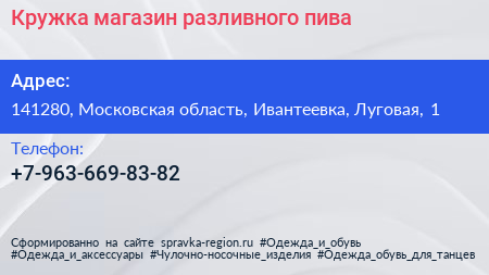 Кружка, магазин разливного пива по адресу 141280, Московская область, Ивантеевка, Луговая, 1 в дальнейшем Организация, размещена в следующих категориях: