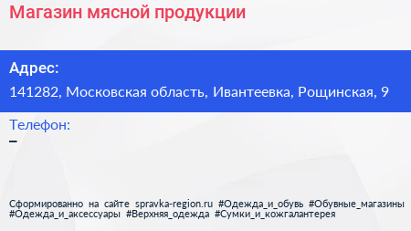 Магазин мясной продукции по адресу 141282, Московская область, Ивантеевка, Рощинская, 9 в дальнейшем Организация, размещена в следующих категориях: