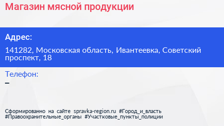 Магазин мясной продукции по адресу 141282, Московская область, Ивантеевка, Советский проспект, 18 в дальнейшем Организация, размещена в следующих категориях: