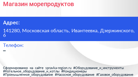 Магазин морепродуктов по адресу 141280, Московская область, Ивантеевка, Дзержинского, 6 в дальнейшем Организация, размещена в следующих категориях: