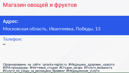 Магазин овощей и фруктов по адресу Московская область, Ивантеевка, Победы, 13 в дальнейшем Организация, размещена в следующих категориях: