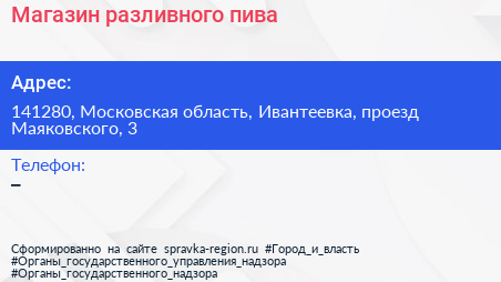Магазин разливного пива по адресу 141280, Московская область, Ивантеевка, проезд Маяковского, 3 в дальнейшем Организация, размещена в следующих категориях: