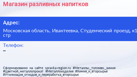 Магазин разливных напитков по адресу Московская область, Ивантеевка, Студенческий проезд, к1 стр в дальнейшем Организация, размещена в следующих категориях: