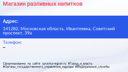 Магазин разливных напитков по адресу 141282, Московская область, Ивантеевка, Советский проспект, 39а в дальнейшем Организация, размещена в следующих категориях: