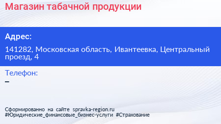 Магазин табачной продукции по адресу 141282, Московская область, Ивантеевка, Центральный проезд, 4 в дальнейшем Организация, размещена в следующих категориях: