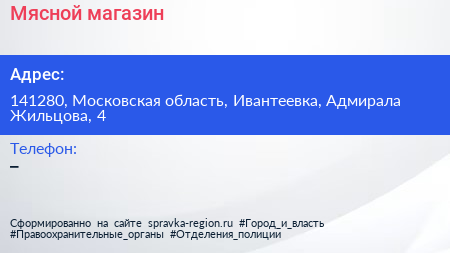 Мясной магазин по адресу 141280, Московская область, Ивантеевка, Адмирала Жильцова, 4 в дальнейшем Организация, размещена в следующих категориях: