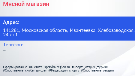 Мясной магазин по адресу 141281, Московская область, Ивантеевка, Хлебозаводская, 24 ст1 в дальнейшем Организация, размещена в следующих категориях: