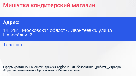 Мишутка, кондитерский магазин по адресу 141281, Московская область, Ивантеевка, улица Новосёлки, 2 в дальнейшем Организация, размещена в следующих категориях: