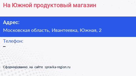 На Южной, продуктовый магазин по адресу Московская область, Ивантеевка, Южная, 2 в дальнейшем Организация, размещена в следующих категориях: