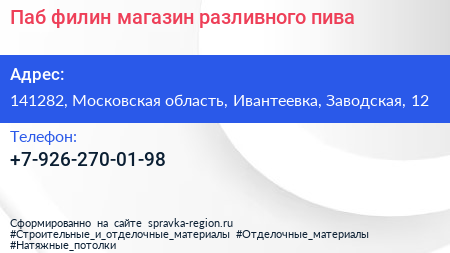 Паб филин, магазин разливного пива по адресу 141282, Московская область, Ивантеевка, Заводская, 12 в дальнейшем Организация, размещена в следующих категориях:
