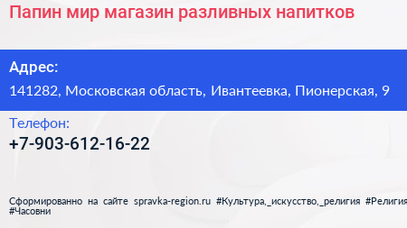Папин мир, магазин разливных напитков по адресу 141282, Московская область, Ивантеевка, Пионерская, 9 в дальнейшем Организация, размещена в следующих категориях: