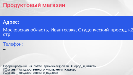 Продуктовый магазин по адресу Московская область, Ивантеевка, Студенческий проезд, к2 стр в дальнейшем Организация, размещена в следующих категориях: