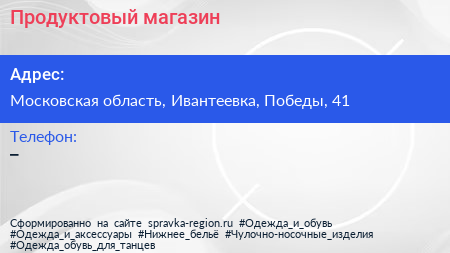 Продуктовый магазин по адресу Московская область, Ивантеевка, Победы, 41 в дальнейшем Организация, размещена в следующих категориях: