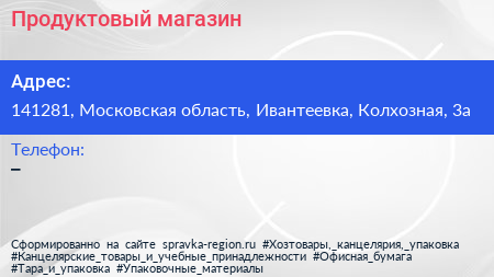 Продуктовый магазин по адресу 141281, Московская область, Ивантеевка, Колхозная, 3а в дальнейшем Организация, размещена в следующих категориях:
