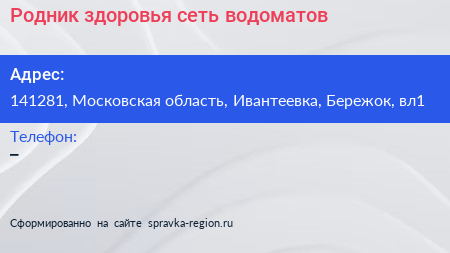 Родник здоровья, сеть водоматов по адресу 141281, Московская область, Ивантеевка, Бережок, вл1 в дальнейшем Организация, размещена в следующих категориях: