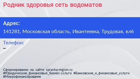 Родник здоровья, сеть водоматов по адресу 141281, Московская область, Ивантеевка, Трудовая, вл6 в дальнейшем Организация, размещена в следующих категориях: