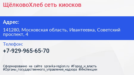 ЩёлковоХлеб, сеть киосков по адресу 141280, Московская область, Ивантеевка, Советский проспект, 4 в дальнейшем Организация, размещена в следующих категориях: