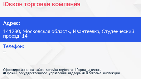 Юккон, торговая компания по адресу 141280, Московская область, Ивантеевка, Студенческий проезд, 14 в дальнейшем Организация, размещена в следующих категориях: