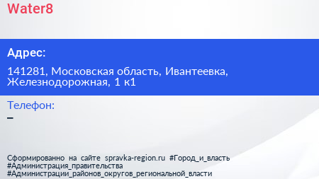 Water8 по адресу 141281, Московская область, Ивантеевка, Железнодорожная, 1 к1 в дальнейшем Организация, размещена в следующих категориях: