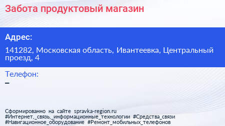 Забота, продуктовый магазин по адресу 141282, Московская область, Ивантеевка, Центральный проезд, 4 в дальнейшем Организация, размещена в следующих категориях: