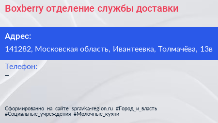Boxberry, отделение службы доставки по адресу 141282, Московская область, Ивантеевка, Толмачёва, 13в в дальнейшем Организация, размещена в следующих категориях: