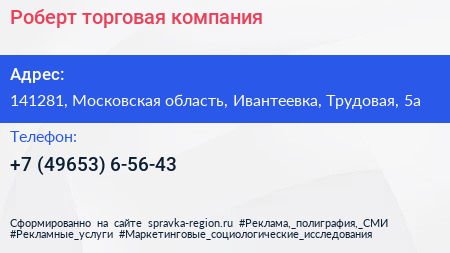 Роберт, торговая компания по адресу 141281, Московская область, Ивантеевка, Трудовая, 5а в дальнейшем Организация, размещена в следующих категориях: