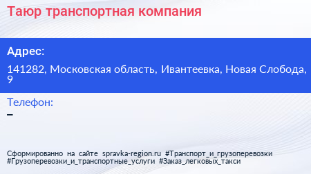 Таюр, транспортная компания по адресу 141282, Московская область, Ивантеевка, Новая Слобода, 9 в дальнейшем Организация, размещена в следующих категориях: